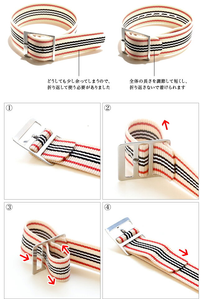 この形状のナイロンベルトは多くありますが、日本人の平均的な手首サイズにはどのベルトも少し余る物が多く、余ったところを折り返して使うのが一般的でした。