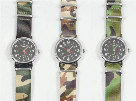 ミリタリー定番の迷彩(カモフラージュ)柄バンド、人気のストライプ柄バンド、 プライベートからビジネスシーンまで幅広く使える単色バンドの3種類のナイロン バンドに、高級感を演出する本革レザーバンドを加えた全4種類をご用意しました。